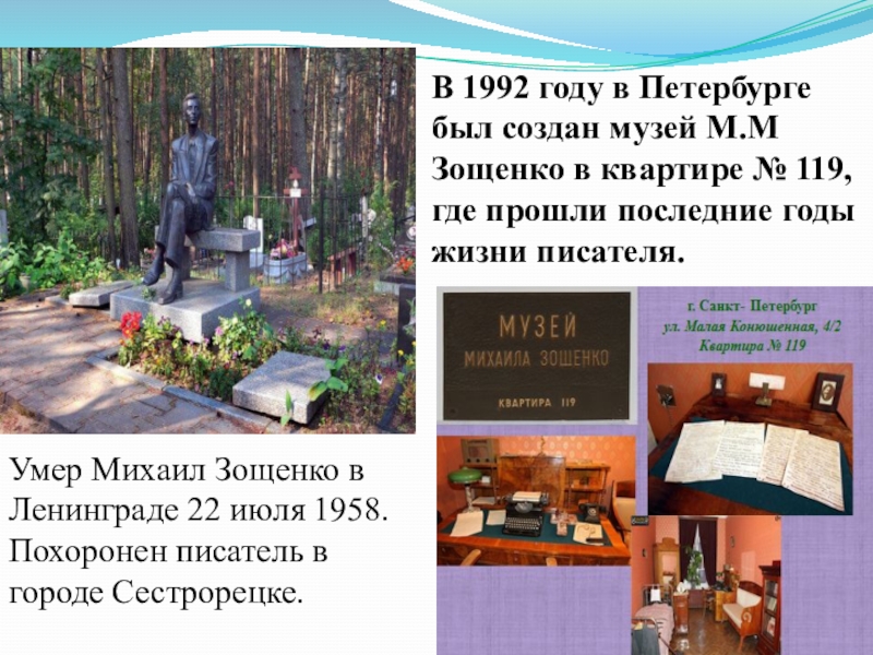 В 1992 году в Петербурге был создан музей М.М Зощенко в квартире № 119, где прошли последние годы жизни писателя.