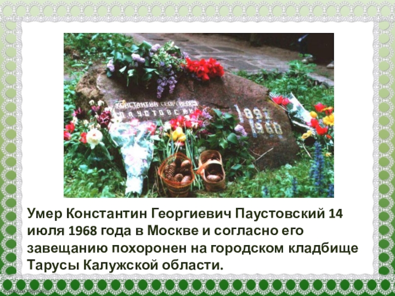 Умер Константин Георгиевич Паустовский 14 июля 1968 года в Москве и согласно его завещанию похоронен на городском