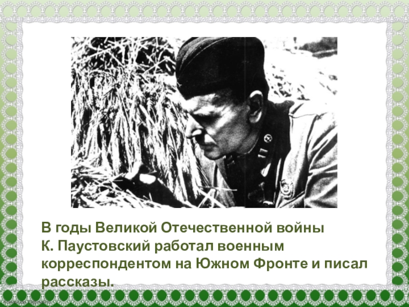 В годы Великой Отечественной войны К. Паустовский работал военным корреспондентом на Южном Фронте и писал рассказы.