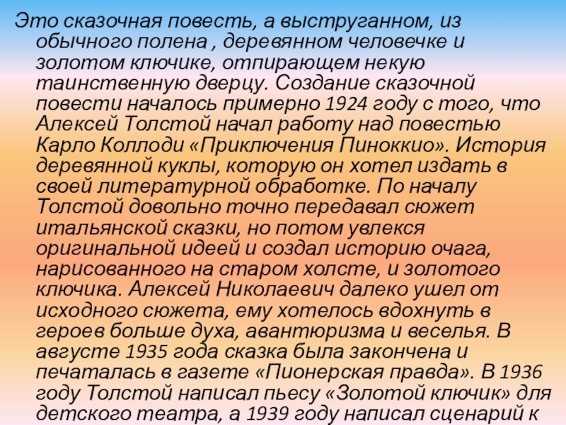 и золотом ключике, отпирающем некую таинственную дверцу. Создание сказочной повести началось примерно 1924 году с того, что Алексей Толстой начал работу над повестью Карло Коллоди «Приключения Пиноккио». История деревянной куклы, которую он хотел издать в своей литературной обработке. По началу Толстой довольно точно передавал сюжет итальянской сказки, но потом увлекся оригинальной идеей и создал историю очага, нарисованного на старом холсте, и золотого ключика. Алексей Николаевич далеко ушел от исходного сюжета, ему хотелось вдохнуть в героев больше духа, авантюризма и веселья. В августе 1935 года сказка была закончена и печаталась в газете «Пионерская правда». В 1936 году Толстой написал пьесу «Золотой ключик» для детского театра, а 1939 году написал сценарий к одноименному фильму.
