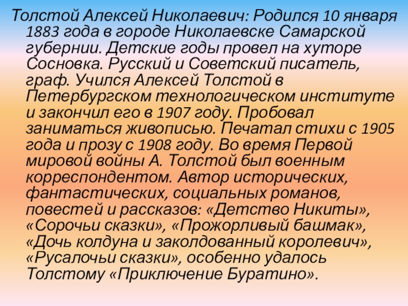 Самарской губернии. Детские годы провел на хуторе Сосновка. Русский и Советский писатель, граф. Учился Алексей Толстой в Петербургском технологическом институте и закончил его в 1907 году. Пробовал заниматься живописью. Печатал стихи с 1905 года и прозу с 1908 году. Во время Первой мировой войны А. Толстой был военным корреспондентом. Автор исторических, фантастических, социальных романов, повестей и рассказов: «Детство Никиты», «Сорочьи сказки», «Прожорливый башмак», «Дочь колдуна и заколдованный королевич», «Русалочьи сказки», особенно удалось Толстому «Приключение Буратино».