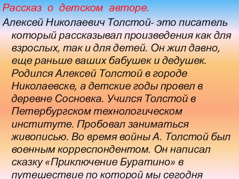 как для взрослых, так и для детей. Он жил давно, еще раньше ваших бабушек и дедушек. Родился Алексей Толстой в городе Николаевске, а детские годы провел в деревне Сосновка. Учился Толстой в Петербургском технологическом институте. Пробовал заниматься живописью. Во время войны А. Толстой был военным корреспондентом. Он написал сказку «Приключение Буратино» в путешествие по которой мы сегодня отправимся.
