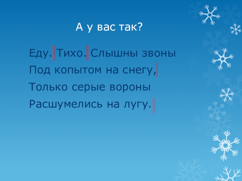 А у вас так?Еду. Тихо. Слышны звоныПод копытом на снегу,Только серые вороныРасшумелись на лугу.