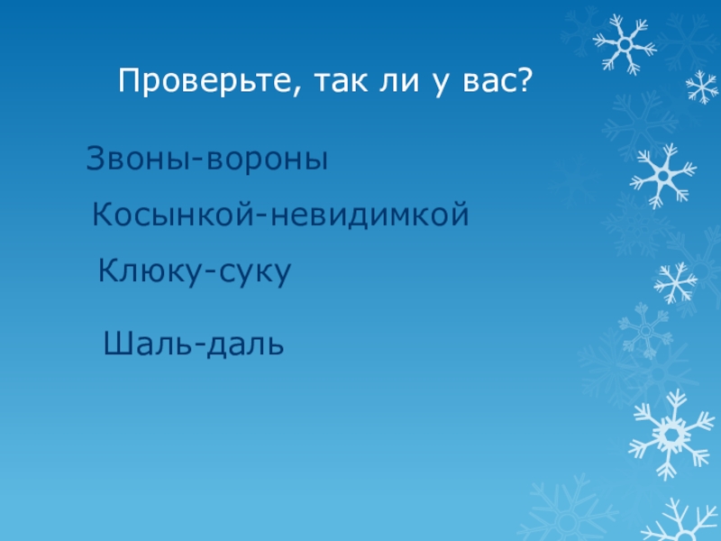 Проверьте, так ли у вас?Звоны-вороныКосынкой-невидимкойКлюку-сукуШаль-даль