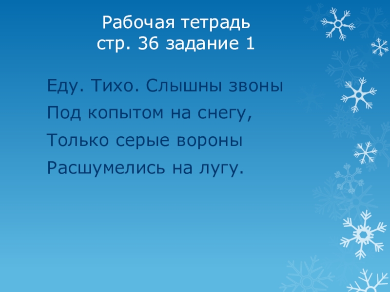 Рабочая тетрадь  стр. 36 задание 1Еду. Тихо. Слышны звоныПод копытом на снегу,Только серые вороныРасшумелись на лугу.