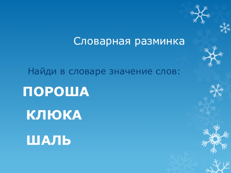 Словарная разминкаНайди в словаре значение слов:ПОРОШАКЛЮКАШАЛЬ