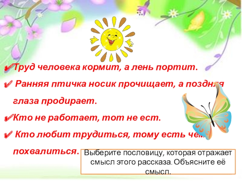 Выберите пословицу, которая отражает смысл этого рассказа. Объясните её смысл.