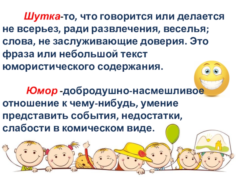 Юмор -добродушно-насмешливое отношение к чему-нибудь, умение представить события, недостатки, слабости в комическом виде.
