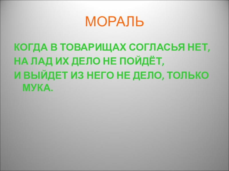 МОРАЛЬКОГДА В ТОВАРИЩАХ СОГЛАСЬЯ НЕТ,НА ЛАД ИХ ДЕЛО НЕ ПОЙДЁТ,И ВЫЙДЕТ ИЗ НЕГО НЕ ДЕЛО, ТОЛЬКО МУКА.
