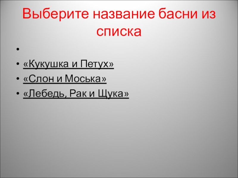 Выберите название басни из списка «Кукушка и Петух»«Слон и Моська»«Лебедь, Рак и Щука»