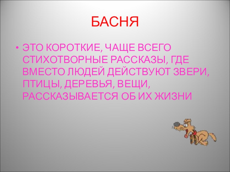 БАСНЯЭТО КОРОТКИЕ, ЧАЩЕ ВСЕГО СТИХОТВОРНЫЕ РАССКАЗЫ, ГДЕ ВМЕСТО ЛЮДЕЙ ДЕЙСТВУЮТ ЗВЕРИ, ПТИЦЫ, ДЕРЕВЬЯ, ВЕЩИ, РАССКАЗЫВАЕТСЯ ОБ ИХ
