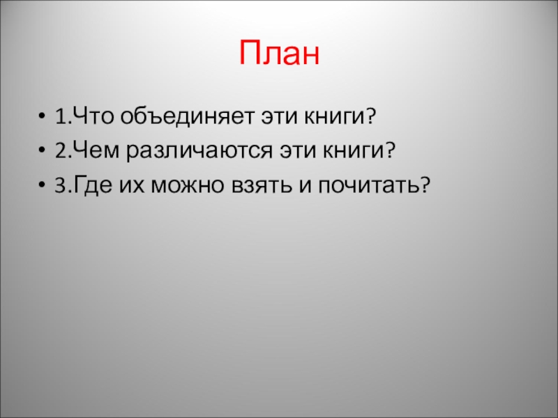 План 1.Что объединяет эти книги?2.Чем различаются эти книги?3.Где их можно взять и почитать?