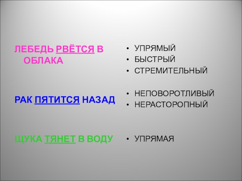ЛЕБЕДЬ РВЁТСЯ В ОБЛАКАРАК ПЯТИТСЯ НАЗАДЩУКА ТЯНЕТ В ВОДУУПРЯМЫЙБЫСТРЫЙСТРЕМИТЕЛЬНЫЙНЕПОВОРОТЛИВЫЙНЕРАСТОРОПНЫЙУПРЯМАЯ
