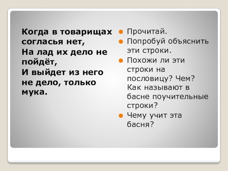 Похожи ли эти строки на пословицу? Чем? Как называют в басне поучительные строки?