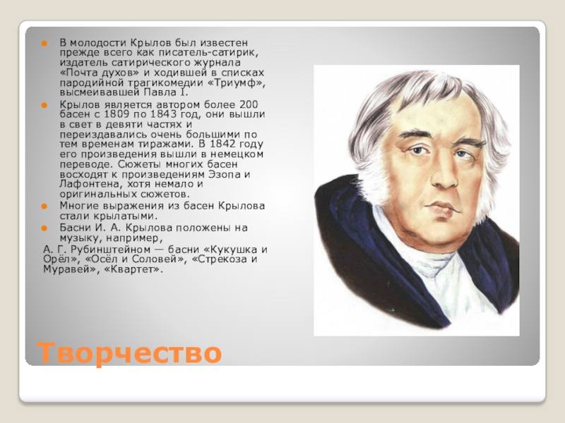 В молодости Крылов был известен прежде всего как писатель-сатирик, издатель сатирического