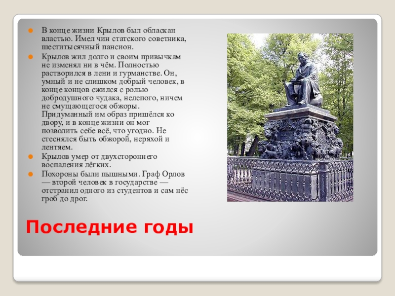 В конце жизни Крылов был обласкан властью. Имел чин статского