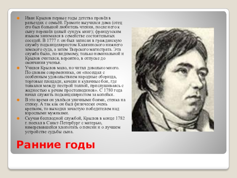 Учился Крылов мало, но читал довольно много. По словам современника, он «посещал с особенным удовольствием народные сборища, торговые площади, качели и кулачные бои, где толкался между пестрой толпой, прислушиваясь с жадностью к речам простолюдинов». С 1780 года начал служить подканцеляристом за копейки.