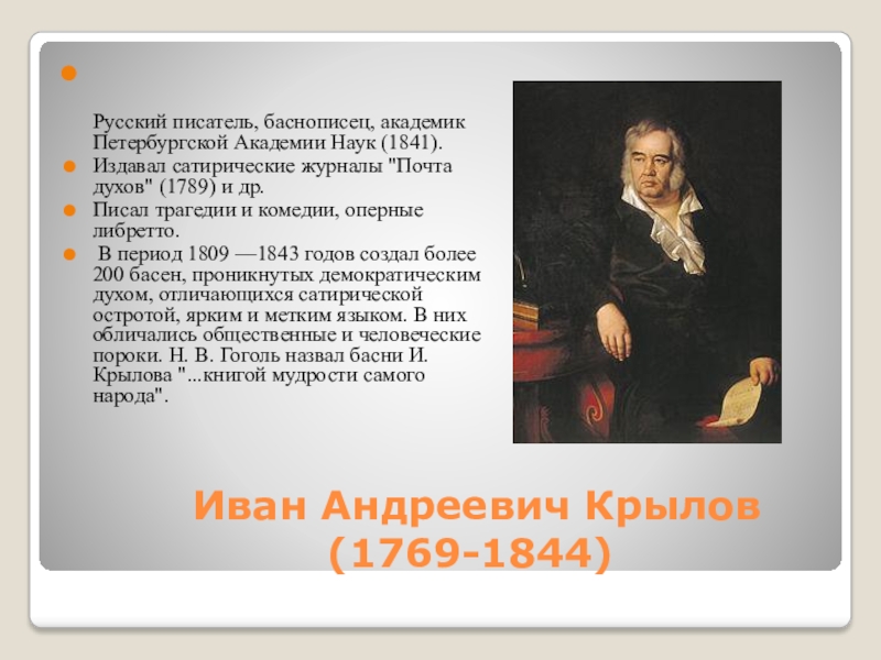Баснописец – писатель, который сочиняет басни. Иван Андреевич Крылов – русский
