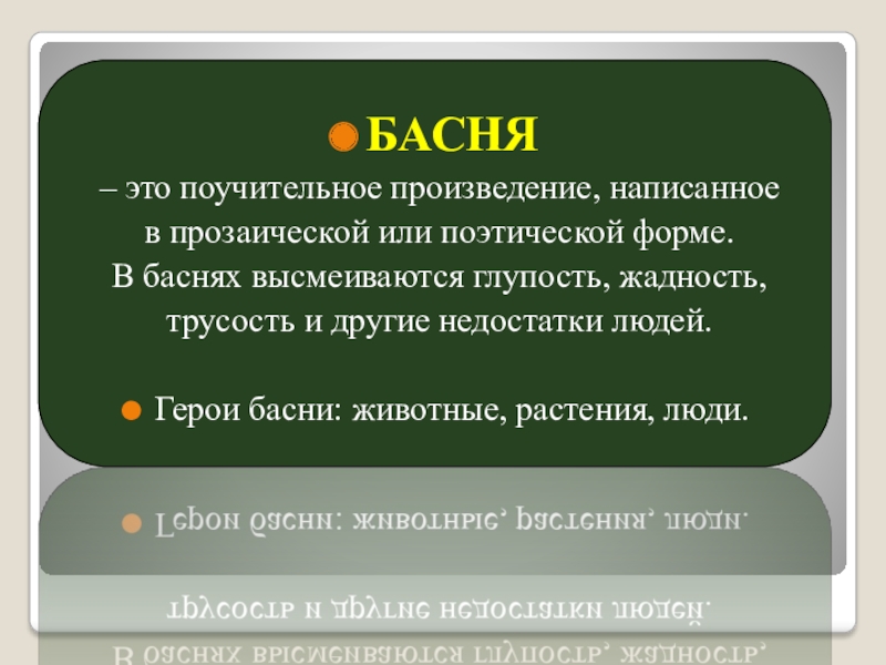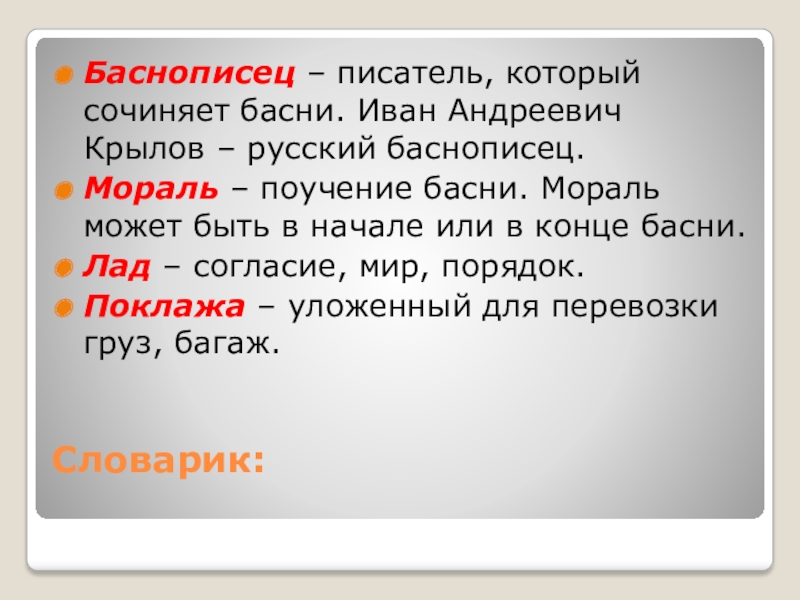 Мораль – поучение басни. Мораль может быть в начале или в конце басни.
