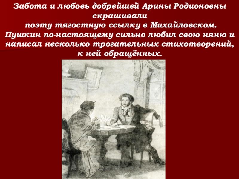 Слайд 7Забота и любовь добрейшей Арины Родионовны скрашивали