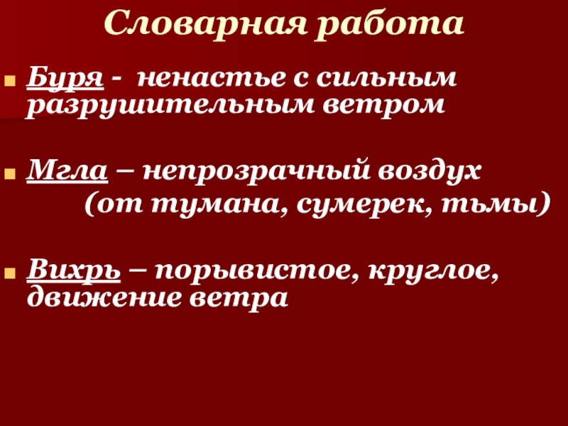 Словарная работаБуря - ненастье с сильным разрушительным ветромМгла – непрозрачный воздух      (от
