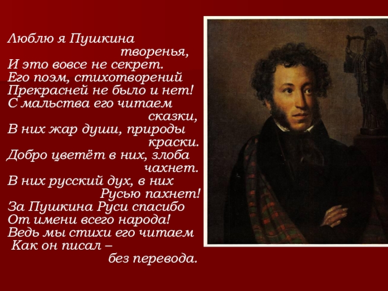 Люблю я Пушкина творенья,И это вовсе не секрет.Его поэм, стихотворенийПрекрасней не было и нет!С мальства его читаем