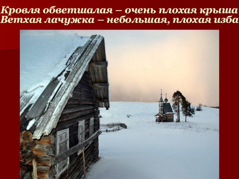 Слайд 14Кровля обветшалая – очень плохая крыша Ветхая лачужка – небольшая, плохая изба