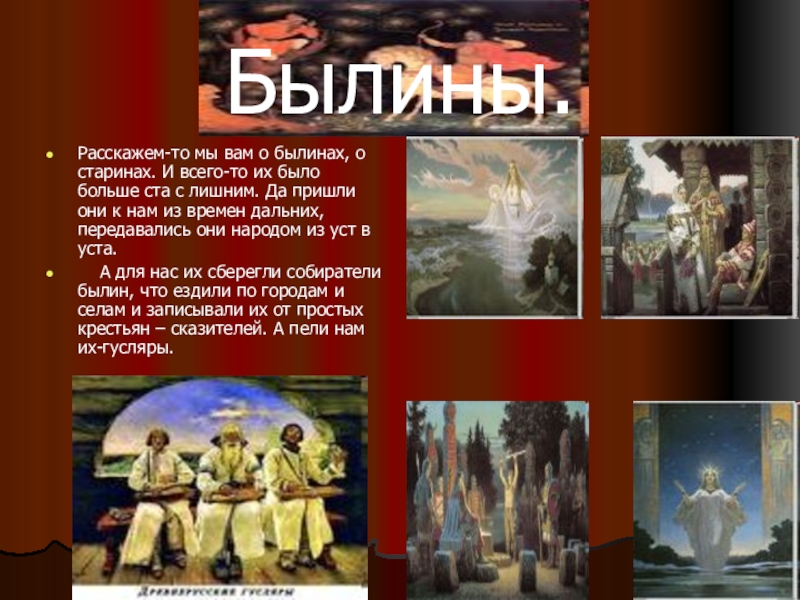 А для нас их сберегли собиратели былин, что ездили по городам и селам и записывали их от простых крестьян – сказителей. А пели нам их-гусляры.