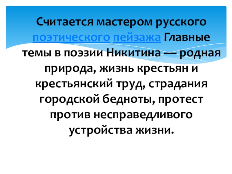 Слайд 9Считается мастером русского поэтического пейзажа Главные темы в поэзии Никитина —