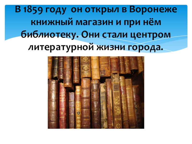 Слайд 7В 1859 году он открыл в Воронеже книжный магазин и при
