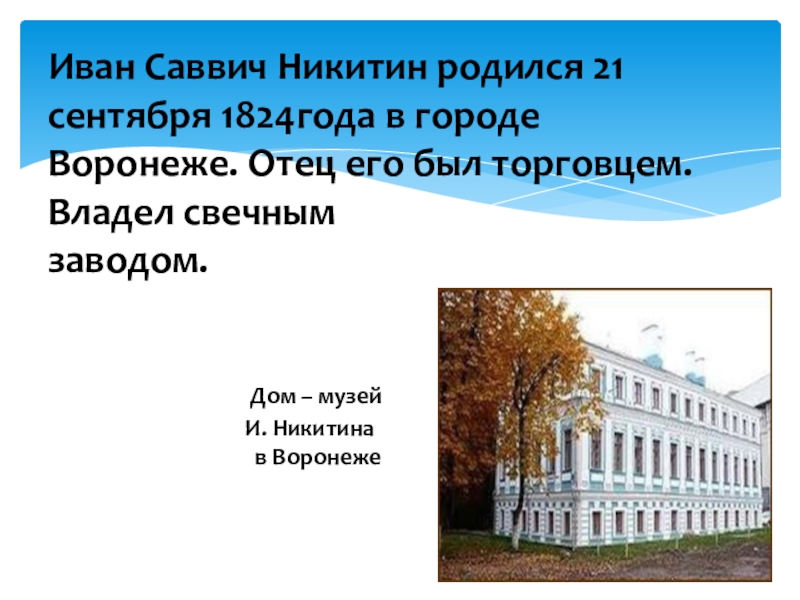 Слайд 4Иван Саввич Никитин родился 21 сентября 1824года в городе Воронеже. Отец
