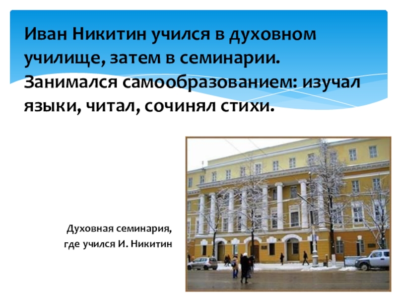 Слайд 5Иван Никитин учился в духовном училище, затем в семинарии. Занимался самообразованием: