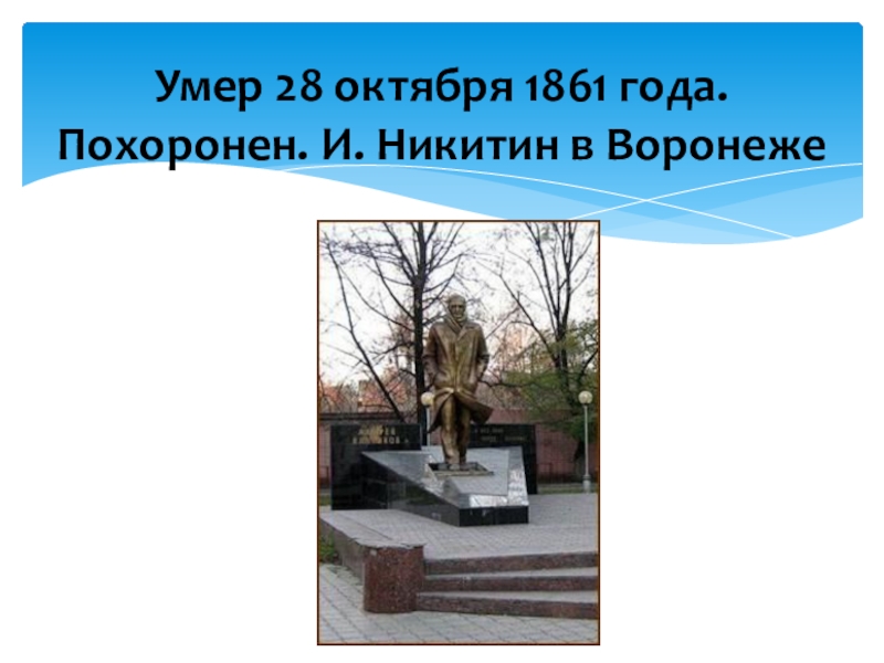 Слайд 11Умер 28 октября 1861 года. Похоронен. И. Никитин в Воронеже