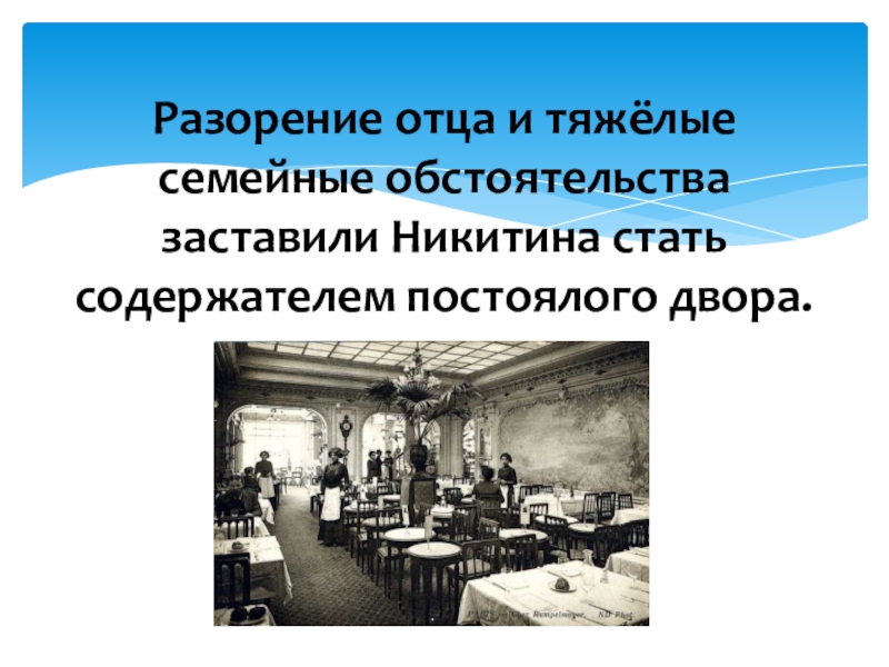 Слайд 6Разорение отца и тяжёлые семейные обстоятельства заставили Никитина стать содержателем постоялого