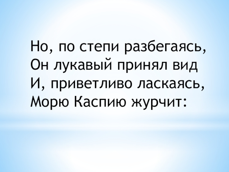 Но, по степи разбегаясь, Он лукавый принял видИ, приветливо ласкаясь,Морю Каспию журчит:
