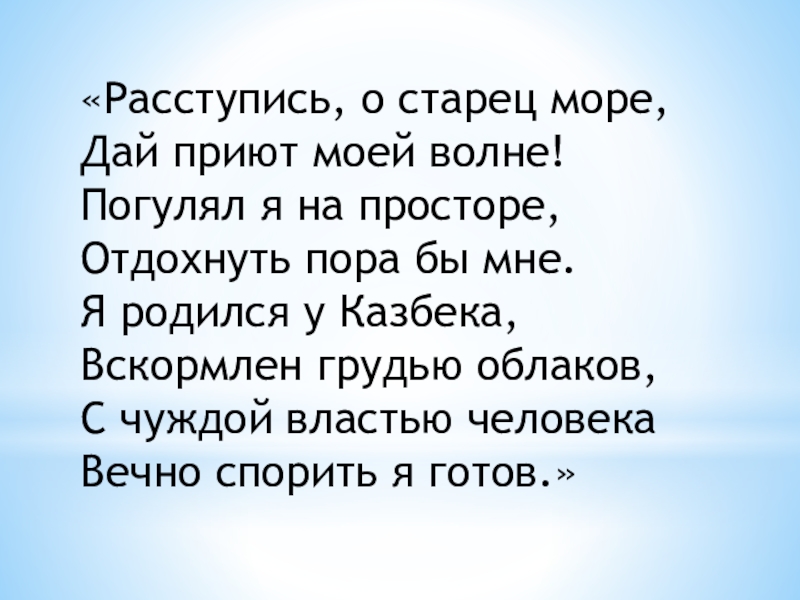 «Расступись, о старец море,Дай приют моей волне!Погулял я на просторе, Отдохнуть пора бы мне.Я родился у Казбека,Вскормлен