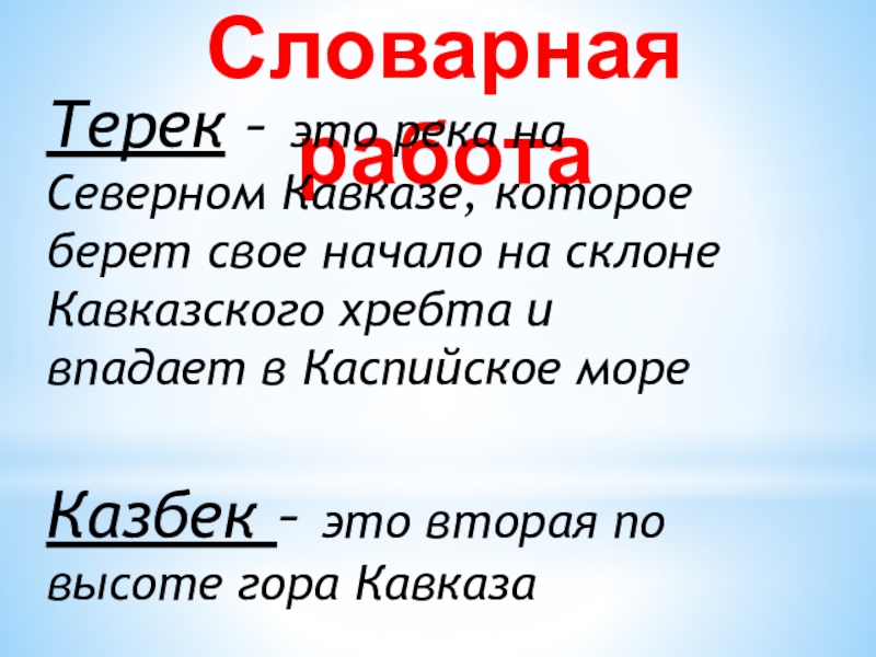 Словарная работаТерек – это река на Северном Кавказе, которое берет свое начало на склоне Кавказского хребта и