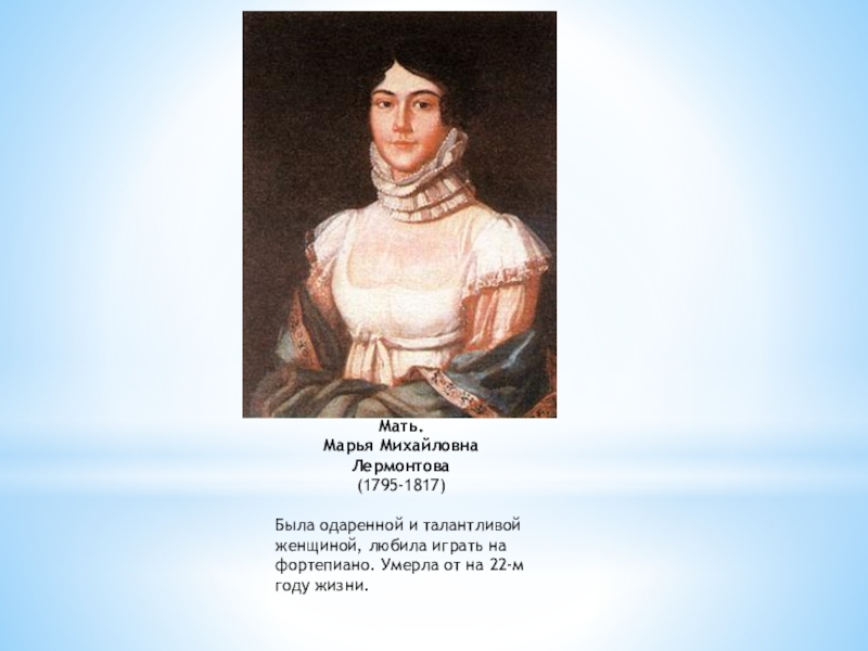 Мать.Марья Михайловна Лермонтова (1795-1817) Была одаренной и талантливой женщиной, любила играть на фортепиано. Умерла от на 22-м году