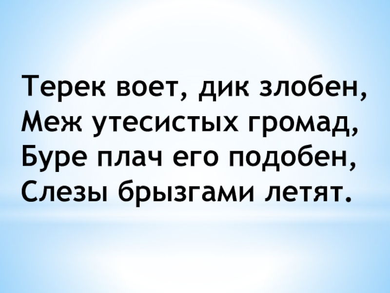 Терек воет, дик злобен,Меж утесистых громад,Буре плач его подобен, Слезы брызгами летят.