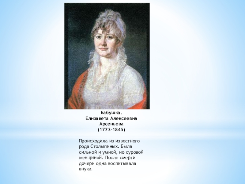 Бабушка.Елизавета АлексеевнаАрсеньева(1773-1845)Происходила из известного рода Столыпиных. Была сильной и умной, но суровой женщиной. После смерти дочери одна