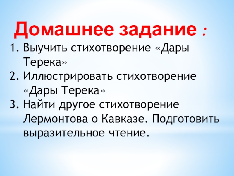 Домашнее задание :Выучить стихотворение «Дары Терека»Иллюстрировать стихотворение «Дары Терека»Найти другое стихотворение Лермонтова о Кавказе. Подготовить выразительное чтение.