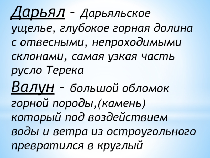 Дарьял – Дарьяльское ущелье, глубокое горная долина с отвесными, непроходимыми склонами, самая узкая часть русло ТерекаВалун –