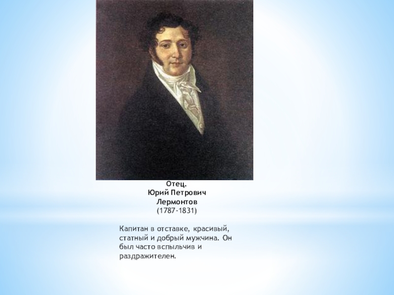 Отец.Юрий Петрович Лермонтов (1787-1831)Капитан в отставке, красивый, статный и добрый мужчина. Он был часто вспыльчив и раздражителен.