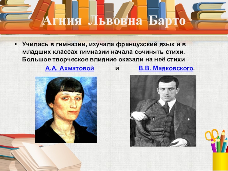 младших классах гимназии начала сочинять стихи. Большое творческое влияние оказали на неё стихи