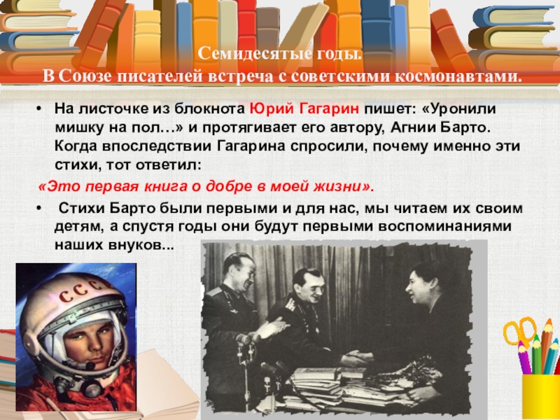 блокнота Юрий Гагарин пишет: «Уронили мишку на пол…» и протягивает его автору, Агнии Барто. Когда впоследствии Гагарина спросили, почему именно эти стихи, тот ответил: