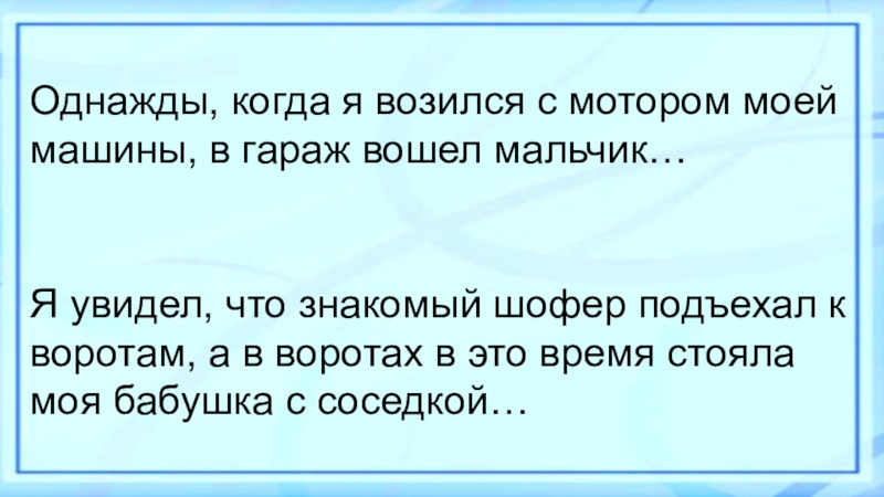 Я увидел, что знакомый шофер подъехал к воротам, а в воротах в это время стояла моя бабушка с соседкой…