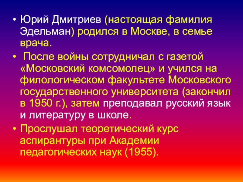 Слайд 2Юрий Дмитриев (настоящая фамилия Эдельман) родился в Москве, в семье врача.