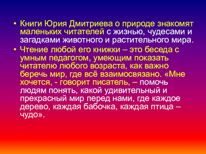 Слайд 6Книги Юрия Дмитриева о природе знакомят маленьких читателей с жизнью, чудесами