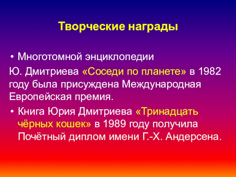 Творческие наградыМноготомной энциклопедии Ю. Дмитриева «Соседи по планете» в 1982 году была присуждена Международная Европейская премия.Книга Юрия