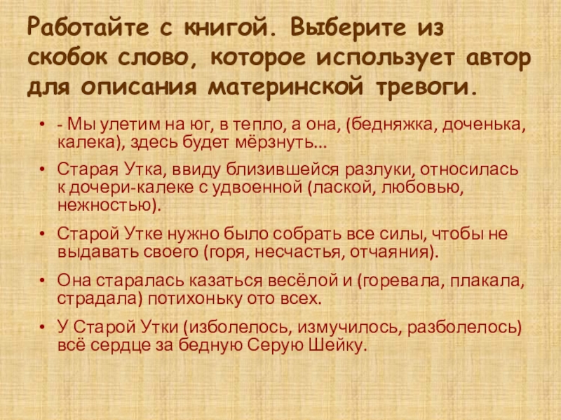 Работайте с книгой. Выберите из скобок слово, которое использует автор для описания материнской тревоги.